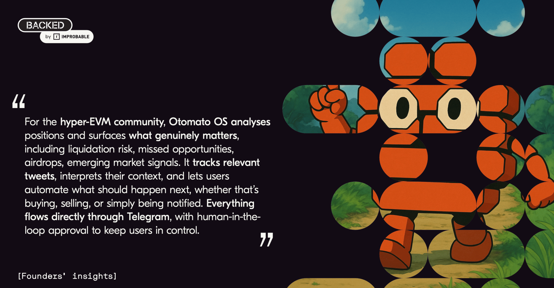 That’s what the DeFi Assistant is designed to do. It’s a free tool that gives users something useful from the moment they plug in their wallet. For the hyper-EVM community, Otomato OS analyses positions and surfaces what genuinely matters, including liquidation risk, missed opportunities, airdrops, emerging market signals. It tracks relevant tweets, interprets their context, and lets users automate what should happen next, whether that’s buying, selling, or simply being notified. Everything flows directly through Telegram, with human-in-the-loop approval to keep users in control.