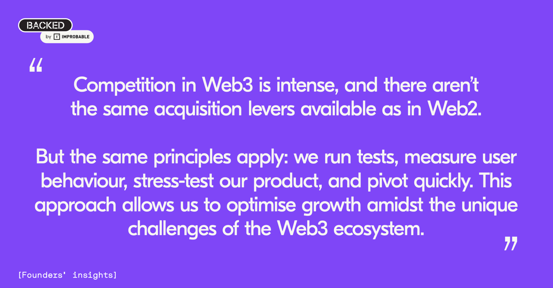 Web3 presents a very different landscape. Distribution is more fragmented, user acquisition is harder, and reaching the right audience in deep DeFi requires focus on channels like Twitter and Reddit. Competition is intense, and there aren’t the same acquisition levers available as in Web2. But the same principles apply: we run tests, measure user behaviour, stress-test our product, and pivot quickly. This approach allows us to optimise growth amidst the unique challenges of the Web3 ecosystem.